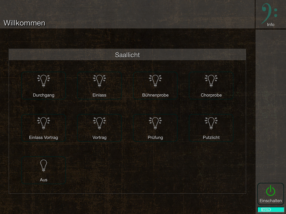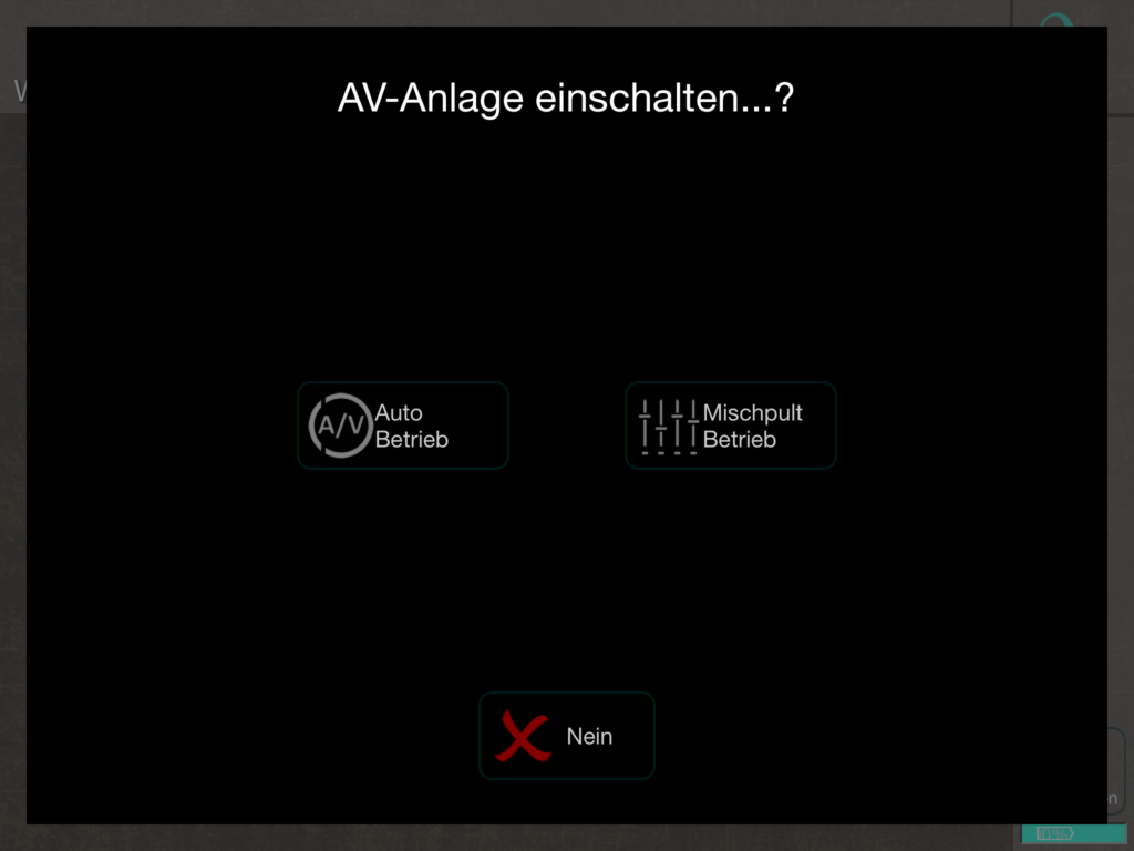 Licht und Ton werden von iPads aus gesteuert. Licht sowohl bei der Säule vorne links, als auch bei der Eingangstür, Ton und Beamer nur vom rechten iPad an der Säule aus.