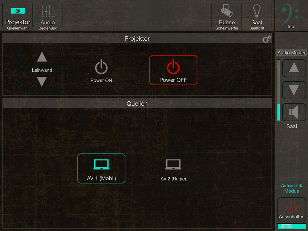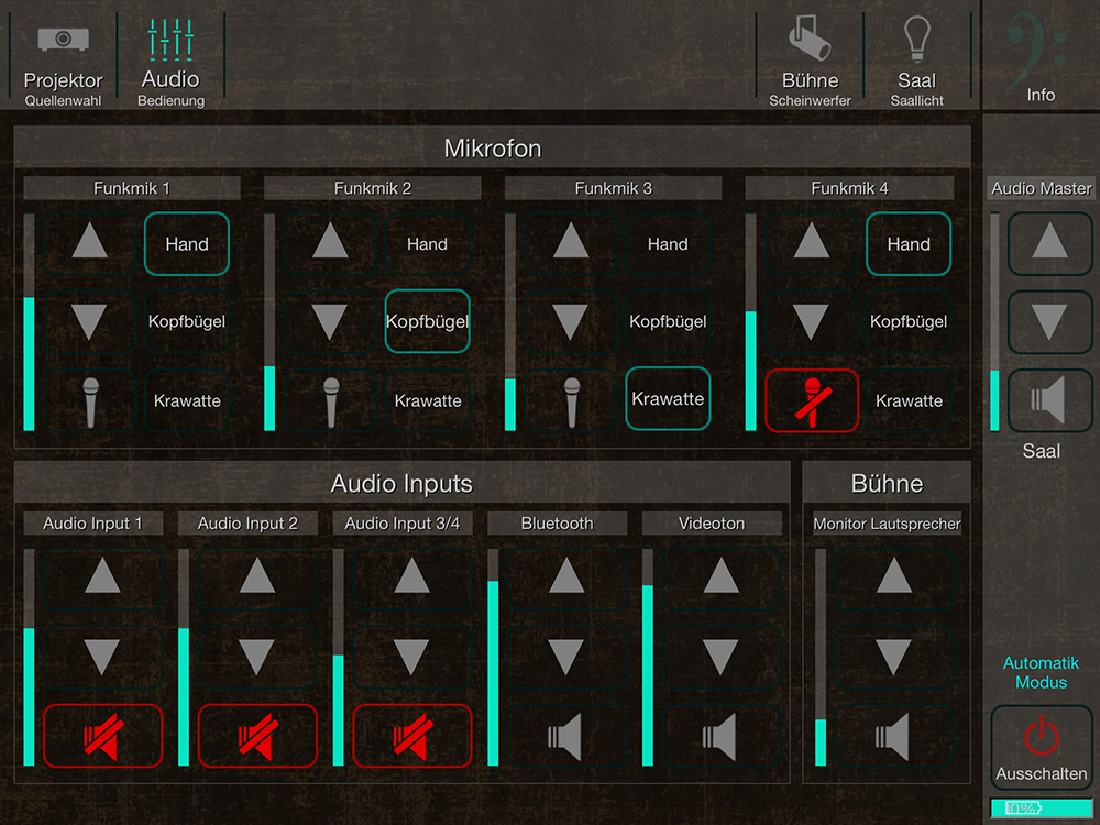 WICHTIG: Quelle wählen (grün umrandet wenn verbunden): Mobil: Pult im Saal. Regie: Anschluss in der Lichtregie.