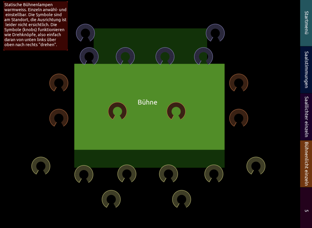 Architekturlicht: alle Pendelleuchten, Strahler und Spots, sowie Arbeitslichter backstage und in der Lichtregie können hier einzeln eingestellt werden.